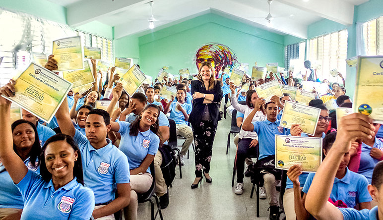 Si quieres tener una sociedad feliz, no puedes descuidar la falta de un código moral”, dice Diana Pedroni, Directora Ejecutiva de El Camino a la Felicidad de la República Dominicana. Un destino turístico por sus playas, cultura, música y gente cálida, la nación también sufre de más de 2 000 muertes violentas al año. “Vi el común denominador”, dijo Pedroni. “Familias rotas, que crearon criminales y luego una sociedad que está decayendo, en lugar de mejorar”. Al buscar soluciones ella encontró El Camino a la Felicidad (TWTH) y pronto se unió con Bienvenido Flores, el Director Nacional de Prevención y Seguridad Ciudadana para el país.